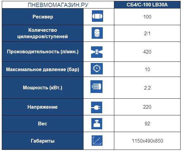 Поршневой блок на СБ4/С-100 LB30A устанавливается двухцилиндровый, который имеет 2 ступени сжатия. На всасывании такой агрегат даёт 420 литров в минуту. Однако реальная производительность, то есть производительность на выходе, безусловно будет меньше. Это связано с особенностями работы поршневых компрессоров в целом: расход на сжатие и нагрев воздуха, наличие «мертвого пространства» в цилиндрах, процесс «дросселирования». Вот основные причины, которые «снижают» производительность поршневого компрессора. И СБ4/С-100 LB30A тому не исключение. Потому что это классический поршневой компрессор с ременной передачей.