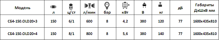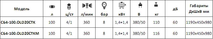 Соответственно это модели: СБ4/C-20.OLD15, СБ4/C-20.OLD20. Технические характеристики компрессоров соответствуют уже знакомым моделям СБ4/C-24.OLD15 и СБ4/C-24.OLD20 в классической компоновке, преимущественно разница только в 20-литровом ресивере.
