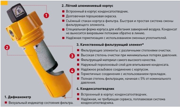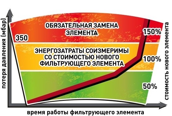 При падении увеличения энергозатрат соизмеримо со стоимостью нового фильтрующего элемента. При падении давления на 350 мбар (максимум) – замена фильтрующего элемента обязательна.