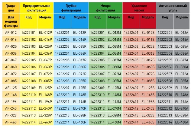 Следует отметить, что к сожалению фильтры серии AF не имеют в комплекте фильтрирующий элемент, поэтому он приобретается отдельно в соответствии с таблицей приведенной ниже.