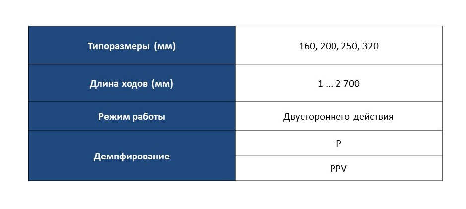 Для типов размеров 250 и 320 мм доступны 2 типа демпфирования - механическое и регулируемое пневматическое, а также доступны версии с переменным X-ходом и полностью конфигурируемые исполнения с различными опциями.