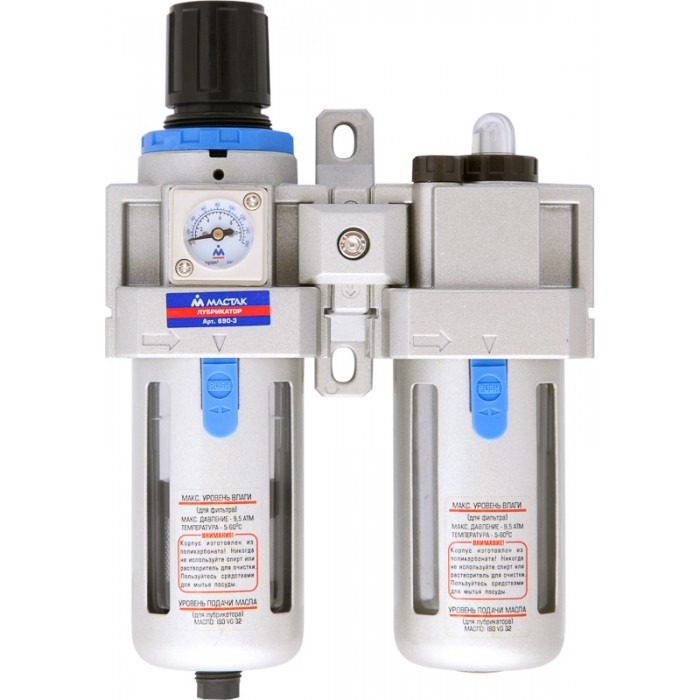 Фильтр влагоотделитель с редуктором и лубрикатором 3/8 Мастак - фильтр влагоотделитель с редуктором и лубрикатором, предназначен для очистки от влаги и пыли сжатого воздуха, поступающего от компрессора к пневмоинструменту.
