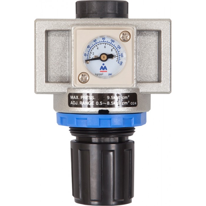 Регулятор давления Мастак (1/2) предназначен для регулирования давления в пневмосистеме. Регулятор имеет выходное отверстие на 1/2 дюйма, есть возможность встроить дополнительные акссесуары. Пропускная способность составляет 2500 л/мин, а максимальное давление не должно превышать 9,5 бар. Манометр встроен в корпус регулятора.